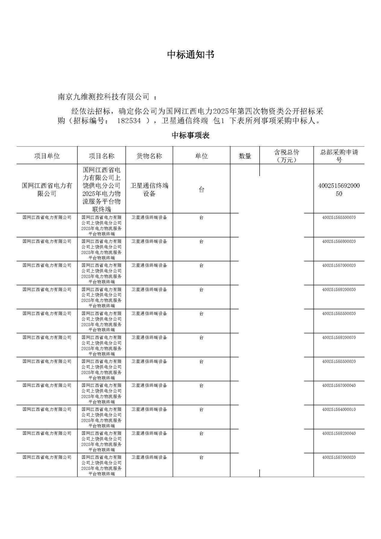 中标喜讯-九维公司中标国网江西卫星通信终端设备